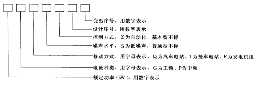 變型序號(hào),用數(shù)字表示 設(shè)計(jì)序號(hào),用數(shù)字表示 控制方式,Z為自動(dòng)化。基本型不標(biāo) 噪聲水平,S為低噪聲。普通型不標(biāo)。移動(dòng)方式。用宇母表示,Q為汽車(chē)電站、T為掛車(chē)電站、F為發(fā)電機(jī)組。電流種類(lèi),用字母表示,G為工頻、P為中頻 。額定功率(kW ),用數(shù)宇表示例如。 20GF7-8柴油發(fā)電機(jī)組,表示額定功率為20kW的工頻(50Hz)柴油發(fā)電機(jī)組 的第七種形式,第八次變型; 50GFSZ1-2柴油發(fā)電機(jī)組,表示額定功率為50kW工頻低噪 聲自動(dòng)化柴油發(fā)電機(jī)組,第一種形式,第二次變型。單相和H相發(fā)電機(jī)組型號(hào)制編方法一 樣,只是技術(shù)規(guī)格方面有所區(qū)別。