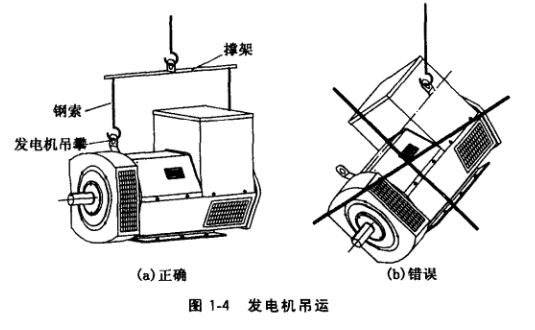 發(fā)電機起吊時.必須使用發(fā)電機上對稱分布的兩個吊攀或位于重心線上的單個吊攀,不允許只用遠離重心線的單吊攀起吊,見圖1-4。吊具的撐架和鋼索承載量必須足夠,且撐架的跨度必須確保起吊時兩根鋼索處于垂直或上端略張開的狀態(tài),以免鋼索碰觸機體。不允許利用發(fā)電機吊攀起吊發(fā)電機組,見圖1-5。