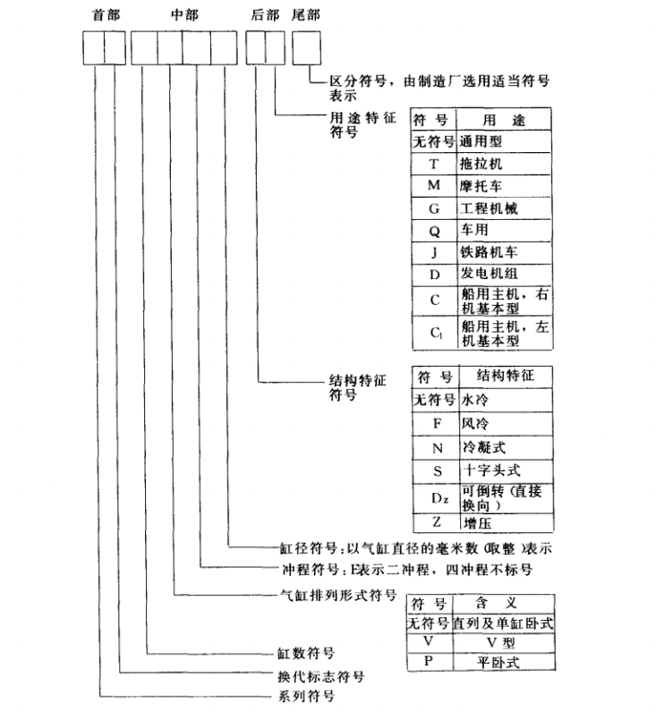 柴油機(jī)、汽油機(jī)統(tǒng)稱內(nèi)燃機(jī),其型號(hào)由首部、中部、后部、尾部四部分組成:
