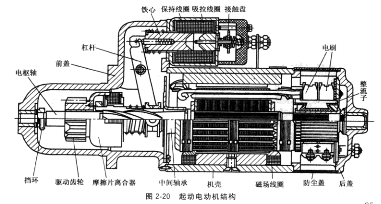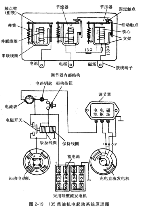 起動(dòng)系統(tǒng)的作用是使內(nèi)燃機(jī)獲得起動(dòng)所需的必要條件,使曲軸獲得必要的起動(dòng)轉(zhuǎn)速。內(nèi)燃機(jī)常見(jiàn)的起動(dòng)方式有人力起動(dòng)、電起動(dòng)等。電起動(dòng)系統(tǒng)包括起動(dòng)電動(dòng)機(jī)、蓄電池、充電發(fā)電機(jī)、調(diào)節(jié)器等,見(jiàn)圖2-19?圖2-22。