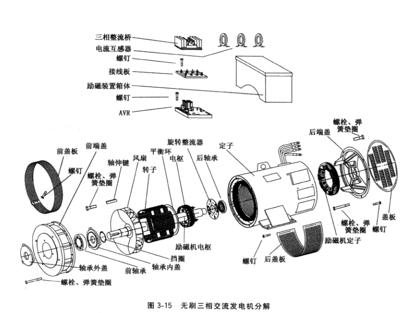無(wú)刷三相交流發(fā)電機(jī)整機(jī)原理電路如圖3-16所示。發(fā)電機(jī)由內(nèi)燃機(jī)驅(qū)動(dòng)旋轉(zhuǎn)至接近額定轉(zhuǎn)速,依靠轉(zhuǎn)子磁極鐵心和交流勵(lì)磁機(jī)定子磁極鐵心的雙重剩磁場(chǎng),嵌在定子鐵心槽中的副繞組(或主繞組抽頭)感應(yīng)出電壓,并經(jīng)AVR中的整流環(huán)節(jié)整流后,輸人交流勵(lì)磁機(jī)定子繞組,建立交流勵(lì)磁機(jī)磁場(chǎng)。交流勵(lì)磁機(jī)電樞三相繞組便感應(yīng)三相交流電壓,該電壓經(jīng)旋轉(zhuǎn)整流器整流成直流電壓,輸人轉(zhuǎn)子磁極繞組,建立發(fā)電機(jī)主磁場(chǎng),使發(fā)電機(jī)定子繞組感應(yīng)三相電壓,輸出三相電能。調(diào)節(jié)AVR中的電位器,可把機(jī)端電壓整定在額定值。負(fù)載時(shí).,由AVR自動(dòng)讕節(jié)發(fā)電機(jī)勵(lì)磁電流,以維持發(fā)電機(jī)電壓恒定。