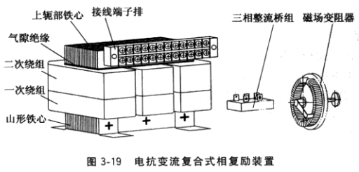 這種發(fā)電機在圖3-4所示有刷三相交流發(fā)電機基本結(jié)構(gòu)基礎(chǔ)上配置一套電抗變流復(fù)合式相復(fù)勵裝置,其外形如圖3-19所示,它包括電抗變流器、三相整流橋組和磁場變阻器。作為可控相復(fù)勵裝置,還必須外配加裝一個分流式自動電壓調(diào)節(jié)器(STL)小功率發(fā)電機可不配分流式自動電壓調(diào)節(jié)器,電壓性能可滿足使用要求。