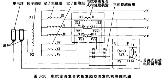 電抗變流復(fù)合式相復(fù)勵三相交流發(fā)電機原理電路如圖3-20所示。發(fā)電機由內(nèi)燃機驅(qū)動至空載轉(zhuǎn)速為額定值附近時,依靠轉(zhuǎn)子鐵心剩磁磁場,發(fā)電機定子副繞組感應(yīng)電壓經(jīng)電抗變流器二次繞組的移相作用,提供一個建立發(fā)電機空載電壓的交流勵磁電流的電壓分量Ifu經(jīng)三相整流橋組整流后向發(fā)電機轉(zhuǎn)子繞組提供空載勵磁電流。定子主繞組經(jīng)串接電抗變流器 —次繞組后輸出三相電壓。當(dāng)發(fā)電機帶上負載后,由電抗變流器的復(fù)勵作用,在二次繞組感應(yīng)一個與發(fā)電機負載電流相對應(yīng)的交流勵磁電流的電流分量Ifi,因此,負載時由Ifu和Ifi兩 個勵磁電流分量幾何疊加,并經(jīng)三相整流,向轉(zhuǎn)子繞組提供負載勵磁電流,從而維持發(fā)電機端電壓恒定。不可控復(fù)合式相復(fù)勵發(fā)電機穩(wěn)態(tài)電壓調(diào)整率一般不大于±5%。