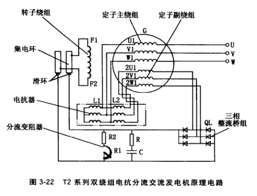 此種發(fā)電機(jī)也是一種相復(fù)勵交流發(fā)電機(jī),它的結(jié)構(gòu)與電抗變流復(fù)合式相復(fù)勵發(fā)電機(jī)基本相似,不同之處在于電抗器的結(jié)構(gòu)和作用,后者電抗器鐵心有氣隙,有初級繞組L1、次級繞組L2,起電抗、變流作用;而前者只有一個繞組,由抽頭將它分成兩部分,分別起電抗、 分流作用。