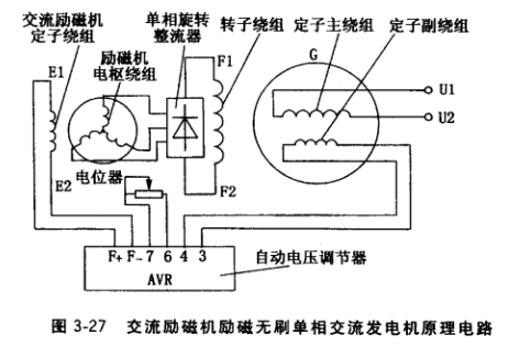 流發(fā)電機(jī)基本相同,不同之處在于定子鐵心槽中的定子主繞組是單相而不是三相,且定子主繞組、副繞組結(jié)構(gòu)與有刷單相交流發(fā)電機(jī)相同,此時定子副繞組的作用是向交流勵磁機(jī)定子 磁極繞組提供勵磁電流。