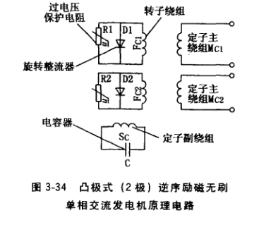 凸極式逆序勵磁無刷單相交流發(fā)電機整機原理電路如圖3-34所示。發(fā)電機由內燃機驅動至空載轉速,依靠轉子鐵心的剩磁磁場,定子副繞組Sc感應電壓,流過的容性電流產生單相脈動磁場。它可分解為順序和逆序兩個旋轉磁場,逆序磁場的旋轉速度與轉子轉速相等,但方向相反,在轉子繞組上感應出2倍發(fā)電機額定頻率的交流電流,經整流后向轉子繞組提供直流電流(勵磁電流〉,建立轉子主磁場;順序磁場旋轉速度與轉子轉速相等,且方向相同,對轉子主磁場起助磁作用。由于定子副繞組流過的是容性電流,容性電流的磁場對 轉子主磁場也起助磁作用。逆、順序磁場共同 作用,在定子主繞組上感應出空載電壓,實現(xiàn) 發(fā)電機自勵建壓。只要定、轉子各繞組參數設 計合理,在空載轉速下,定子主繞組感應的電 壓便可達額定值。定子主繞組Mc1,和Mc2串聯(lián) 時發(fā)電機輸出230V電壓,并聯(lián)時輸出115V 電壓。發(fā)電機負載時,其工作原理與隱極式逆 序勵磁單相交流發(fā)動機基本相同。