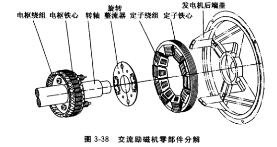 (1)電樞。包括電樞鐵心、電樞繞組、三相旋轉(zhuǎn)整流器。