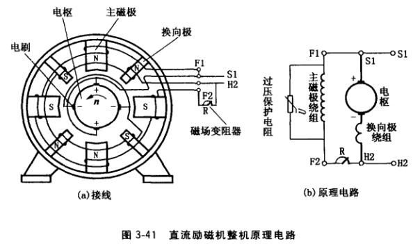 直流勵磁機整機工作原理電路如圖3-41所示。當(dāng)勵磁機被驅(qū)動至一定轉(zhuǎn)速時,依靠定子主磁極鐵心剩磁,在電樞繞組中感應(yīng)交流電勢,經(jīng)換向器換向整流作用,從電刷輸出直流電。電刷的正、負電位按右手定則決定:圖中主磁極N極下的電刷為正電位,用“+”表 示,主磁極S下的電刷為負電位,用表示“-”,把引線端S1和F1連接,F(xiàn)2串聯(lián)變阻器后與H2連接,則從S1、H2引出的電壓就是直流勵磁機發(fā)出的直流電。調(diào)節(jié)磁場變阻器 R,可以整定輸出的直流電壓值。圖3-41a中有數(shù)量與主磁極相等的換向極,它能改善換向, 最大限度減少或消除換向器火花。換向極繞組接線方法是:順著電樞旋轉(zhuǎn)方向看,換向極的極性應(yīng)該和下面一個主磁極(即后切割電樞繞組的磁極)相同。圖3-41b中換向極電路接線應(yīng)是:端點H2→換向極繞組→電刷負刷,這樣依據(jù)換向極繞組和主磁極繞組繞向,并規(guī)定主磁極電路電流方向從F1流入,換向極電路電流從H2流入,按右手螺旋定則即可判定每個換向極極性和隨后的主磁極極性相同。
