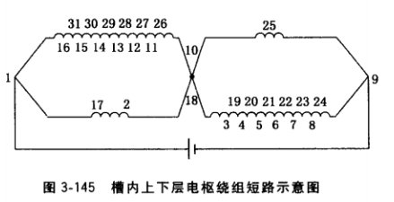 ③由于直流電壓是加在換向片1和9,根據(jù)圖3-143b可知16、17對(duì)1是等電位點(diǎn),24、 25對(duì)9也是等電位點(diǎn),用毫伏表測量相鄰片16、17及24、25片間電壓等于零或極小,不可誤認(rèn)為短路。為了進(jìn)一步判斷該兩處是否有短路,可分別測量1、16, 1、17, 24、9, 25、9片間電壓,讀數(shù)為零或極小者為短路。