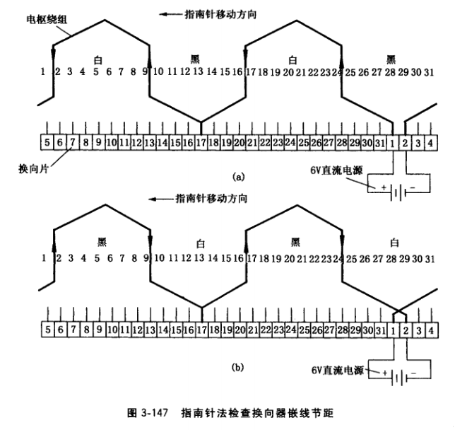 ②用指南針沿通電的繞組依次移動(dòng),觀察 指南針指向是否異常,可以判斷嵌線錯(cuò)誤。圖 3-147以換向片1、2所連接的電樞繞組為例,檢測時(shí)把電樞垂直放S臺(tái)面。圖a為IH確嵌線,在換向片1、2施加6V直流電壓,正極接片1,負(fù)極接片2,此時(shí)繞組電流方向如箭頭 所示,把指南針靠近電樞表面順時(shí)針移動(dòng)一周,磁針指向先后順序?yàn)楹?、白、黑、白。依?方法,逐個(gè)測試換向片2、3, 3、4……磁針指向均應(yīng)黑、白、黑、白。圖b中與換向片1、 2連接的電樞繞組引線嵌錯(cuò),這時(shí)電樞繞組中電流方向與圖a相反,則指南針順時(shí)針移動(dòng)一 周時(shí),磁針指向與圖a相反。說明檢測過程中,磁針指向規(guī)律突然變反,可斷定該處繞組在 換向片上嵌反。