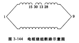 (1)一處斷路。假定連接于13、29兩片上的電樞繞組斷路,用毫伏表逐片測量片間電壓,圖3-143b中斷路的這一路出現(xiàn)兩種情況:片間無斷路的,讀數(shù)為零,測到28、29, 13、14片間電壓時(shí)毫伏表出現(xiàn)電壓讀數(shù),因外加電壓經(jīng)無斷路的各段繞組后在該兩處有電 壓,這就可以斷定13、29片間繞組斷路。