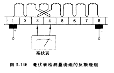 ①在被測支路兩端換向片施加低壓直流電 源(一般為6V),用毫伏表依次測量換向器片 (如片3、4)間電壓,如圖3-146所示,有倒讀 數(shù)(表針反轉(zhuǎn)〉出現(xiàn),片2、3之間以及片4、5 之間讀數(shù)加倍,其他各處均正常,則斷定接到 換向片3、4的繞組接反。