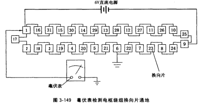 (1)電樞繞組與換向器連接一體情況下?lián)Q向器通 地,可用毫伏表法檢測。6V直流電源加于換向片1、9,毫伏表一端接地,另一端由片1或9開始逐片測量對地電壓,如圖3-149所示,若換向器某處通地,由于越接近接地點,換向片對地電壓越低,當毫伏表指示的電壓接近零時,該換向片疑為通地。再繼續(xù)測量以下各片對地電壓,若毫伏表讀數(shù)又逐片大起來,則可斷定對地電壓接近零的換向片及其所連接的電樞繞組通地。此時必須脫開電樞繞組與該片連接,若測得該片對地電壓仍為最小或接近零,可斷定該換向片通地。