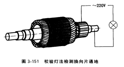 ②校驗燈法。用220V交流電經(jīng)1個燈泡接于轉軸,如圖3-151所示,按順序逐片檢測, 若燈泡發(fā)亮,說明該換向片通地。
