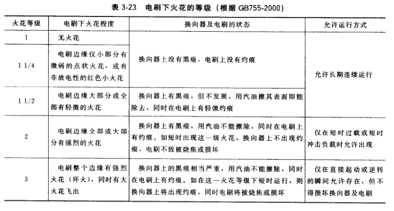 直流勵磁機運行中換向器與電刷滑動接觸面處的火花,可按表3-23的規(guī)定鑒別火花等級,并確定其能否繼續(xù)工作。