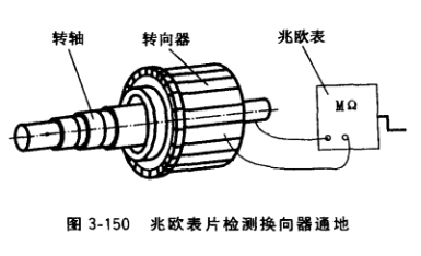 ①兆歐表法。如圖3-150所示,兆歐表兩接線端分別接觸轉軸和換向片,由慢到快搖動兆歐表手把,逐片測量換向片對轉軸絕緣電阻,若絕緣電阻為零,可斷定該片通地。