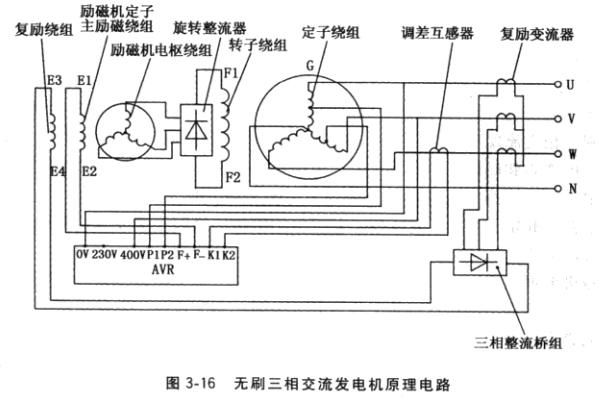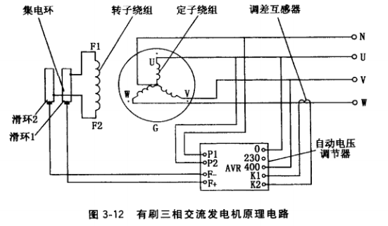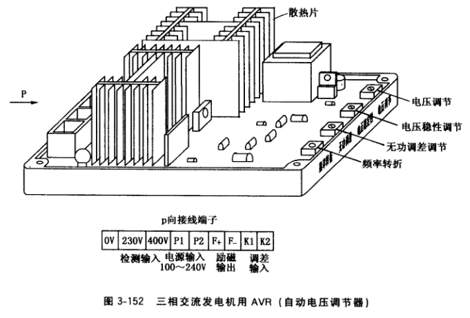 AVR功能及接口:檢測電壓輸入,接于發(fā)電機(jī)三相輸出端線電壓400V或相電壓230V上;電源電壓輸入P1、P2,,接于發(fā)電機(jī)定子主繞組U、V相中點(diǎn)抽頭200V或機(jī)端相電壓 230V上(有的AVR不分檢測輸入和電源輸入,僅設(shè)置一個(gè)電壓信號(hào)接口,接于機(jī)端相電壓或線電壓上);勵(lì)磁輸出F+、F-(有的標(biāo)志為F1、F2),接于有刷發(fā)電機(jī)集電環(huán)電刷引線(見圖3-12)或無刷發(fā)電機(jī)交流勵(lì)磁機(jī)定子主勵(lì)磁繞組線端E1、E2 (見圖3-16);調(diào)差輸入K1、K2 (露出電位器旋鈕),接于W相上的調(diào)差互感器二次繞組線端,考慮到50kW 以下發(fā)電機(jī)一般不作并列運(yùn)行,有的小型AVR就不設(shè)置調(diào)差環(huán)頻率轉(zhuǎn)折(低頻保護(hù)用),已在AVR內(nèi)部接好線而不外接;電壓調(diào)節(jié)(露出電位器旋鈕),已在AVR內(nèi)部接好線而不外接;電壓穩(wěn)定性(露出電位器旋鈕),已在AVR內(nèi)部接好線而不外接。有的AVR 還設(shè)置有外接電位器接口,用于需遠(yuǎn)程外接調(diào)節(jié)電壓的發(fā)電機(jī);有的AVR還設(shè)罝有外接常開起勵(lì)按鈕,用于鐵心容易失磁的發(fā)電機(jī)。