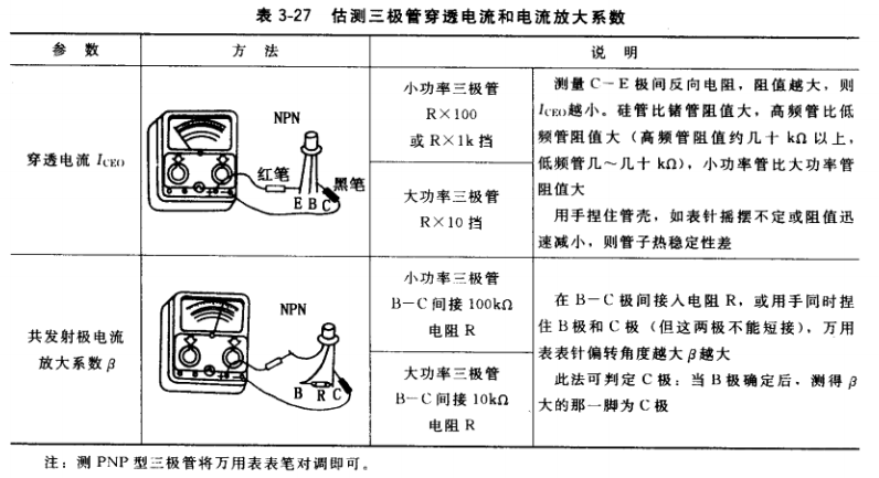 (5)三極管。三極管管腳極性識別和性能檢測,除用晶體管特性圖示儀外,也可用萬用表。檢測時不宜用萬用表的RX1擋,這擋內(nèi)阻較小,流過三極管電流較大;也不宜用RX 10k擋,這擋電壓較高,可能會損壞一些低反壓三極管。測大功率三極管可選用RX 10擋。 此外,僅用萬用表只能大致定性估計三極管一些參數(shù)的情況。詳見表3-27。有的萬用表上 有HFE擋,可用來測定小功率管的電流放大系數(shù)β。