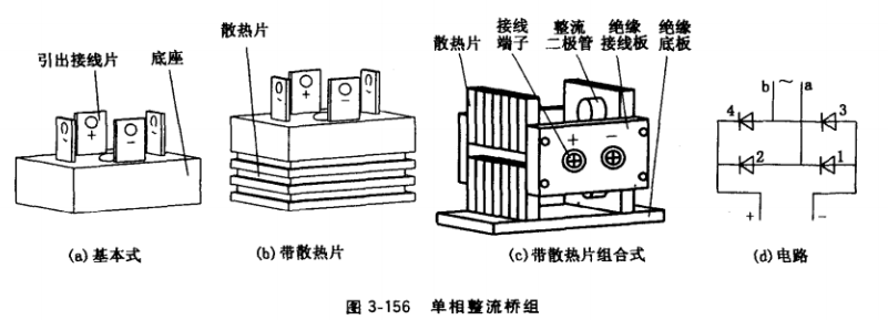 發(fā)電機(jī)常用的單相整流橋組基本結(jié)構(gòu)有3種,如圖3-156所示。4個整流元件按單相橋式整流電路連接后,固封于底座殼內(nèi),為基本式(見圖3-156a); 4個整流元件按單相橋式整流電路連接后,固封于帶散熱器的底座內(nèi)(見圖3-156b); 4個整流元件分別裝在4個散熱片上,經(jīng)前后2個絕緣接線板及絕緣底板組合后,連接成單相橋式整流電路,交、直流接線端子分別設(shè)置在前后絕緣接線板上(見圖3-156C)。以上3種整流橋組外形、結(jié)構(gòu)不同, 但其中4個整流元件連接成的單相橋式整流電路(見圖3-156d)是相同的。