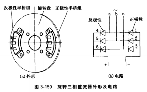 旋轉(zhuǎn)三相整流器可由6個旋轉(zhuǎn)整流元件固定在旋轉(zhuǎn)盤(絕緣盤)上,但目前無刷發(fā)電機(jī)用旋轉(zhuǎn)三相整流器更多的是由正極性和反極性旋轉(zhuǎn)三相整流半橋組各1個安裝在旋轉(zhuǎn)盤上組合而成,其結(jié)構(gòu)及電路如圖3-159所示。