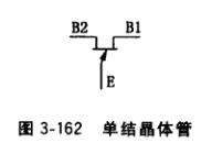 (4)單結(jié)晶體管。單結(jié)晶體管有一個發(fā)射極E和兩個基極B1、B2 (見圖3-162),所以又稱為雙基極二極管,發(fā)射極E與第一基極B1和第二基極B2都是PN結(jié)關(guān)系,因此,可按整流二極管檢測方法檢測。用萬用表RX100擋,測量E對B1和E對B2的正、反向電阻,正常時正向電阻均為∞,反向電阻為0,否則說明管子已損壞,反向電阻很小則說明穿透電流過大或已損壞。