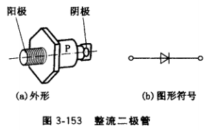 整流二極管有正、反極性兩種結(jié)構(gòu),正極性的底座為陽極,引線端為陰極,外殼上常用P代號標(biāo)識;反極性的底座為陰極,引線端為陽極,外殼上常用R代號標(biāo)識。圖3-153是正極性整流二極管外形及圖形符號。整流二極管簡易檢測方法: