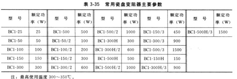 (8)常用瓷盤變阻器及其電阻主要參數(shù)見表3-35。