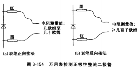 (1)用萬用表檢測整流二極管極性和二極通、斷。由于萬用表上黑表筆的插口與萬用表內(nèi)的電池正極相連,紅表筆的插口與萬用表內(nèi)的電池負(fù)極相連, 因此,可根據(jù)圖3-154檢測。當(dāng)萬用表黑表筆接觸二極管底座,紅筆接引線端時(見圖a),整流二極管應(yīng)處于正向?qū)顟B(tài),萬用表表針正向偏擺,指示幾歐姆至幾十歐姆;當(dāng)黑、紅筆與二極管反接時(見圖b),二極管處于反向截止?fàn)顟B(tài),指示值大于幾百千歐姆,表示該元件為正極性二極管,無短路、無斷路。當(dāng)萬用表仍然是黑表筆接觸二極管底座,紅筆接引線端時,但指示的電阻值卻與上述相反,則表示該元件為反極性二極管。