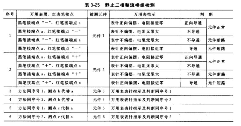 靜止三相整流橋組簡易檢測及判斷方法見表3-25。按圖3-157b逐個檢測整流元件是否正常(檢測前交流側(cè)、直流側(cè)各1個接點(diǎn)應(yīng)拆離外電路)。