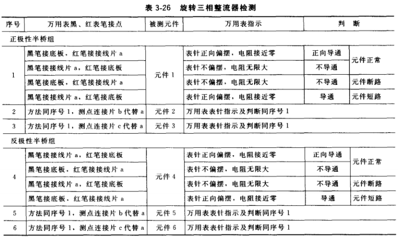 旋轉(zhuǎn)三相整流橋組簡易檢測及判斷方法見表3-26。按圖3-158逐個檢測整流元件是否正常(檢測前交流側(cè)、直流側(cè)各1個接點(diǎn)應(yīng)拆離外電路)。
