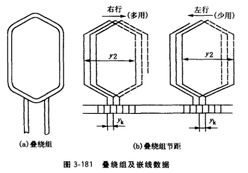 對(duì)單疊繞組:yk = ±l,對(duì)雙疊繞組yk = ±2。yk取正值時(shí)繞向?yàn)橛倚胁唤徊?,如圖 3-181b所示,一般都采用這種繞法。yk取負(fù)值時(shí)繞向?yàn)樽笮薪徊妫@種繞法極少采用。