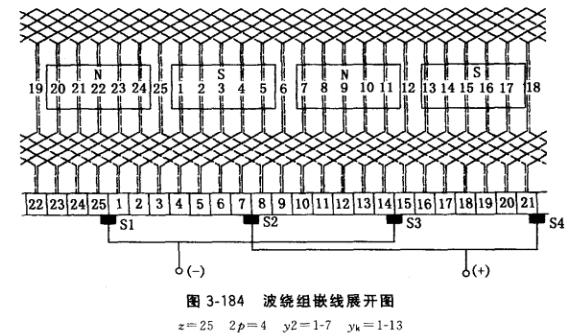 圖3-184為4極、 25槽、換向器25片的電樞波繞組的嵌線展開圖。