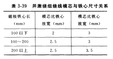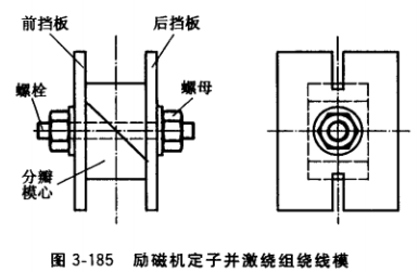 (1)繞線模。繞線模由模芯和擋板組成,兩瓣模芯各固定在前后擋板后,靠螺栓緊固而成,如圖3-185所示。繞線模芯尺寸可根據(jù)原來繞組的尺寸或直接測量磁極鐵心尺寸而定,考慮到鐵心極身絕緣厚度及裝配間隙,模芯長、寬方向尺寸應比磁極鐵心大,表3-39為確定繞線模模芯與鐵心尺寸關系的經(jīng)驗數(shù)據(jù)。