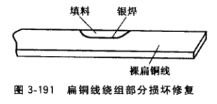 單獨修理的換向極繞組都采用手工繞制。由于過熱燒壞的繞組,只要更換匝問絕緣材料,重新浸漆處理即可。匝間短路或嚴重損壞的繞組,亦可采用局部修復的方法修復:損壞部分不超過導線截面積的1/5時,可用銀焊或銅焊補滿損壞部分;繞組某部分損壞面積達 1/3時,可用銅焊填充或以相當大小的銅塊填充并用銀焊條焊牢,如圖3-191所示。繞組部分損壞面積超過1/3時,則要切除損壞部分,重繞幾匝新線,用銀焊焊接起來。銅線接頭應 在繞組直線邊上,不可連接在圓弧處,接頭處應互成45°左右的斜角,如圖3-192所示。繞組大面積損壞則須更換繞組。