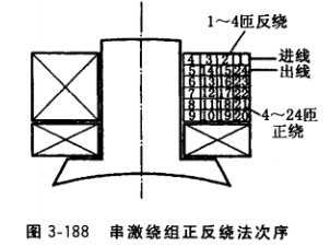 (2)絕緣扁導線繞制。一般可利用并激繞組的繞線模繞制。把繞線模裝到繞線機上,使計數(shù)表回零。根據(jù)所繞匝數(shù)設定串激繞組層數(shù)及每層匝數(shù)。為使串激繞組出線頭引出、連接方便,不發(fā)生短路,要求繞組的底、面線引線都處于繞組外層表面,為此一般采用正、反繞繞線法,如圖3-188所示。例如,某一串激繞組共24匝,分繞4層,每層6匝,繞第一層時先按4匝的總長取出來反繞到線模上,扎住線頭,然后繼續(xù)順繞第一層5?9匝,第二層10?14匝,第三層15?19匝,第四層20?24匝。