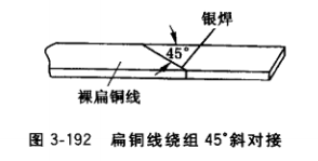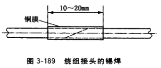 每只繞組基本上只允許有一個接頭,導線接頭處必須斜對接或鉸接,外包的搪錫銅膜(銅膜長10?20mm)作為補強材料,焊接時應焊透焊牢。錫焊接頭的方法如圖3-189所示。