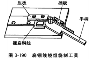 (3)裸扁銅線繞制。串激繞組所用的裸扁銅線 一般寬而薄,多匝的扁銅線又往往順扁平方向立繞,因此必須使用立繞的專用工具,如圖3-190所示。繞制步驟如下: