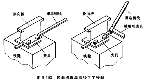 手工繞制方法如圖3-193所示。把換向極鐵心反向用螺栓固定在鐵凳上,銅線首端用夾具固定在墊板上,用噴燈加熱換向極彎角處的銅線,直至紫紅色,然后立即在此處裝上槽形彎邊具,用鐵錘敲打該彎邊具的尾部,并以噴燈繼續(xù)加熱銅線彎邊處,按裸扁銅線串激繞組的同樣繞法,彎出換向極繞組的第一只直角(彎前襯好絕緣層所需厚度的墊塊),依次繞完最后一匝。把整個繞組進行退火處理,然后整形、去毛刺,最后在匝間墊上規(guī)定的絕緣材料,并用玻璃絲帶扎緊。