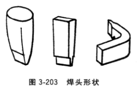 (2) 工藝準備。調(diào)整電樞接頭片之間距離。采用接線槽的換向器,應使接線槽垂直于換向器。采用升高片的換向器,升高片垂直于換向器且距離應均勻。在升高片之間通常要敲入梯形(退拔)木塞頭,使升高片之間一般保留1/3升高片的高度的空隙,以便放電烙鐵頭, 如圖3-202b所示。將換向器升高片的外端面圓周銼平、銼光,并立即涂以松香溶液,防止銅皮產(chǎn)生氧化膜。焊接時絕不能讓電樞繞組引線頭高出換向器接線槽(接線槽必須加工有足夠深度)。