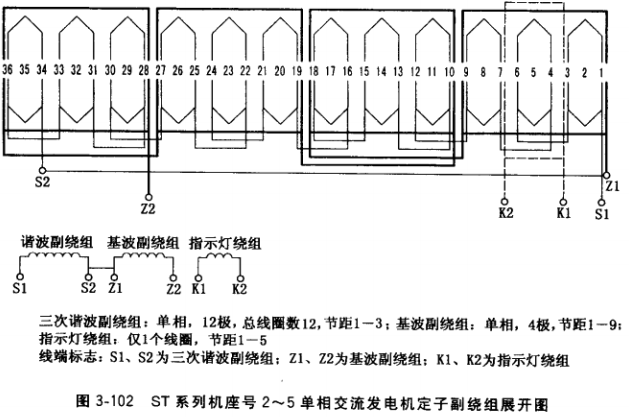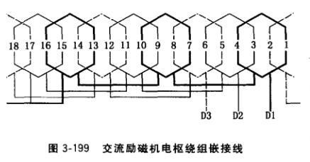 (3)定子副繞組接線。三相的,按圖3-198及其說明的方法,單相的按上述“單相交流發(fā)電機定子繞組嵌線”的方法,示例見圖3-102。
