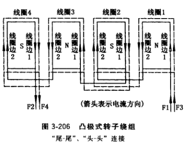 (1)按圖3-205介紹的“尾-頭”連接法把第一相3個線圈接成極性為N、S、N、S、 N、S的6個極的相繞組。