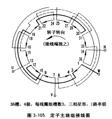 (1)定子三相主繞組接線。要獲得三相繞組的正確接線,必須符合4點要求:每一相繞組必須接成該發(fā)電機規(guī)定的極數(shù),且均布于定子圓周; 任意兩相繞組之間相位差應等于 120°電角度;三相電壓U、V、W的相序應符合順相序,按設計規(guī)定或銘牌規(guī)定接成三相繞組。以圖3-105所示36槽、4極、每線圈組槽數(shù)3、1路串聯(lián)、三相星形接法的定子主繞組接線為例,介紹接線方法。圖中,內圈帶箭頭的12個弧線表示12個線圈組(4極發(fā)電機, 每相一般設計有4個線圈組,三相共有12個線圈組),箭頭方向表示每相4個線圈組要形成 4極極性N、S、N、S所必需的正確的電流方向,數(shù)碼編號表示槽號,中間的帶箭頭圓弧線 表示轉子旋轉方向(從定子繞組接線端視之)。接線順序: