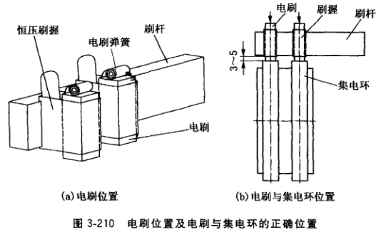 (3)電刷的正確安裝,電刷必須和刷握、刷桿等組合成電刷裝置,如圖3-210a所示。 然后固定在發(fā)電機(jī)后端蓋的內(nèi)軸承蓋上,方可正常運行。電刷裝置與集電環(huán)或換向器之間應(yīng)有正確的安裝位置(見圖3-210b):電刷應(yīng)垂直于集電環(huán)外圓周面,刷握下緣邊與集電環(huán)外圓周面的距離應(yīng)為3?5mm,在軸向方向上電刷應(yīng)位于集電環(huán)寬度的中間位置。