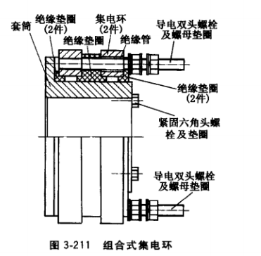 (2)更換集電環(huán)??烧埌l(fā)電機(jī)生產(chǎn)廠家提供同規(guī)格新集電環(huán),或就地加工組合式集電 環(huán),其結(jié)構(gòu)如圖3-211所示。圖中每個序號代表1個零件,根據(jù)集電環(huán)的總體尺寸,制作每個零件,并組裝成集電環(huán)。集電環(huán)中兩個滑環(huán)應(yīng)經(jīng)對地及環(huán)與環(huán)之間耐壓檢測,合格后經(jīng)浸絕緣漆處理,裝上轉(zhuǎn)子,再經(jīng)車床加工外圓面后,方可投入使用。