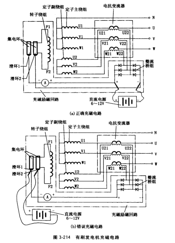(2)兩種錯誤充磁方法。一是直流電源“+”極觸電刷、滑環(huán)2, “-” 極觸電刷、滑環(huán)1,見圖3-214b,此時直流電流表表針正向偏擺,若發(fā)電機有旋轉,交流電壓表指示電壓上升,但充磁電源一脫離,發(fā)電機就隨之失壓。因為在這種情況下,充磁電源所激勵的勵磁電流方向與整流橋組輸出的勵磁電流方向相反,不可能維持發(fā)電機勵磁電流;二是直流電源 “+”極觸整流橋組“-”端,“-”極觸整流橋組“+”端,則表現(xiàn)為勵磁電流表表針反偏,交流電壓表指示電壓上升,但充磁電磁一脫離,發(fā)電機隨之失壓。因為在這種情況下, 充磁電源所激勵的勵磁電流方向也與整流橋組輸出的勵磁電流方向相反,不可能維持發(fā)電機勵磁電流。