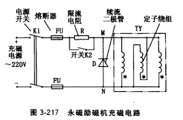 ①接線。如圖3-217所示,把永磁機定子三相繞組任一相反相,然后三相繞組并聯(lián)連接。續(xù)流二極管D用于在切斷充磁電源時,給定子三相繞組儲能提供放電回路,以免繞組產生過電壓而導致定子繞組絕緣損壞。限流電阻 R可用500?1000W電阻爐或同容量燈泡。開 關K2與電阻R并聯(lián),K2合上時,將電阻R短 路。直流充磁電源經(jīng)開關K1、熔斷器FU后 接入。