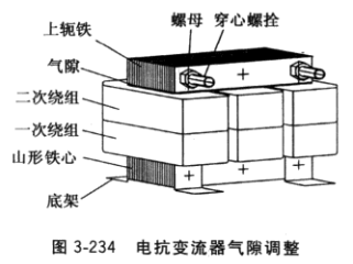 ①松開電抗器或電抗變流器(見圖3-233、圖3-234)穿心螺栓、螺母,提髙上軛鐵, 在氣隙熱入所需厚度的絕緣依片,再往下壓緊上軛鐵,鎖緊螺母。墊入氣隙中的墊片厚度以 保證發(fā)電機(jī)電壓不低于1. 05倍額定值為準(zhǔn)。
