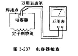 ①檢査定子副繞組與電容器間焊接是否良好。如圖3-236 所示,用萬用表R×1擋,一根表筆搭焊點一側(cè)的電容器引線片上,另一根表筆搭焊點另一側(cè)的導線上,若接點焊接良好,電阻應趨于0Ω,焊接不良便有一定電阻。若電容器由多個并聯(lián)焊接,還必須分別測量所有焊接點電阻,若焊接處脫焊、虛焊,則趨于大阻值,此時可用25W或45W電烙鐵重新焊過,直至萬用表指示趨于0Ω為止。
