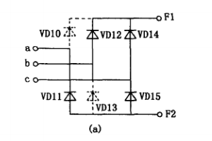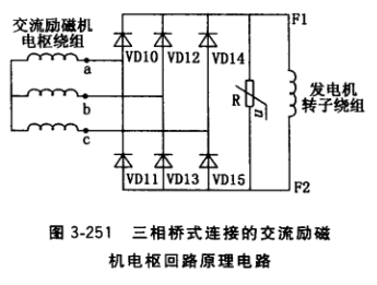 (2)原因分析。用于無刷發(fā)電機的交流勵磁機電樞繞組一般為三相星形接法,它與旋轉(zhuǎn)整流元件直接連接,整流方式有三相橋式和三相半波兩種,不管哪一種方式,只要有一個旋轉(zhuǎn)整流元件因過壓或過流損壞而短路,都將造成此故障?,F(xiàn)以圖3-251的三相橋式連接的交流 勵磁機電樞回路為例說明。若整流元件VD10 損壞,當電樞繞組電壓Uab或Uac為最大值時,三相整流橋可正常工作,而在其他情況下三相整流橋都不能正常工作。例如,Ubc為最大正值 時(即b點電位最高,a點電位最低,電流回路一定是b—VD12—VD10—a,而不可能是 b—VD12—F1—F2—VD11—a。這就造成兩種結(jié)果:其一,發(fā)電機轉(zhuǎn)子繞組F1F2得不到勵磁電流;其二,整流元件VD12將因電樞電壓Uba輸出回路b—VD12—VD10—a短路而過電 流,直至燒毀。同理,可分析其他時刻的整流情況??傊?,三相整流橋VD10?VD15中某個硅元件損壞,必然使轉(zhuǎn)子繞組F1F2的平均電流減小,從而使發(fā)電機端電壓下降,并有可能擴大故障,使其余整流件相繼損壞,導致勵磁機電樞繞組因持續(xù)過流而燒毀。