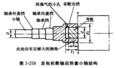 ③在現(xiàn)場(chǎng)最方便、可行的辦法是熱套小軸法。根據(jù)發(fā)電機(jī)結(jié)構(gòu)選擇熱套小軸的部位,一 般可選擇在軸的非配合擋。繪制小軸草圖,確定各擋尺寸,凡配合擋尺寸均與斷軸相符,在非配合擋處確定小軸與母軸的配合尺寸ι和d,并根據(jù)結(jié)構(gòu)情況決定小軸外徑d1,如圖3-259所示。檢驗(yàn)尺寸應(yīng)滿(mǎn)足強(qiáng)度要 求。若d>D,則檢驗(yàn)可省略。